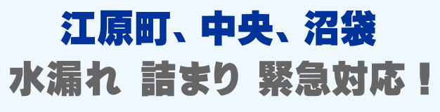 江原町、中央、沼袋での水の困った即解決!急な水道トラブルに緊急でかけつけ訪問し、蛇口の水漏れ、トイレ詰まり、排水の溢れ、タンクの故障など修理いたします。